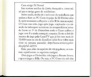 Estava eu tranquilo a ler o livro da Linha Avançada (programa diário sobre desporto na antena3) e entre testemunhos de grandes Lendas (ou lendias, como diria o outro) do Futebol português, como Toni, Oceano, Rodolfo Reis, Carlos Manuel, Octávio Machado e tantos outros, quando dei de caras com um desabafo que enviei em tempos ao José Nunes (grande jornalista que para além de realizar a Linha Avançada, colabora também com a Antena 1 e com a SporTV) dando conta da "roubalheira" que o nosso FC Crato vinha a ser vitima na recta final da sua primeira passagem pela III Divisão Nacional.